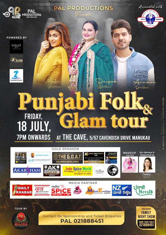 ਆਕਲੈਂਡ, 4 ਜੁਲਾਈ – ਪਾਲ ਪ੍ਰੋਡਕਸ਼ਨ ਵੱਲੋਂ ‘ਪੰਜਾਬ ਫੋਕ ਐਂਡ ਗਲੈਮ ਟੂਰ’ 18 ਜੁਲਾਈ ਨੂੰ ਕਰਵਾਇਆ ਜਾ ਰਿਹਾ ਹੈ। ਪਾਲ ਪ੍ਰੋਡਕਸ਼ਨ ਦੇ ਹਰਪਾਲ ਸਿੰਘ ਪਾਲ ਨੇ ਦੱਸਿਆ ਕਿ ਇਹ ਪ੍ਰੋਗਰਾਮ ਮੈਨੁਕਾਓ ਦੇ ਕੈਵਨਡਿਸ਼ ਡ੍ਰਾਈਵ ਉੱਤੇ ਪੈਂਦੇ ‘ਦੀ ਕੇਵ’ (The Cave, 5/57 Cavendish Drive, Manukau) ਵਿਖੇ ਸ਼ਾਮੀ 7.00 ਵਜੇ ਤੋਂ ਆਰੰਭ ਹੋ ਕੇ ਦੇਰ ਰਾਤ ਤੱਕ ਚੱਲੇਗਾ। ਇਸ ਪ੍ਰੋਗਰਾਮ ਵਿੱਚ ਮਾਹੀ ਗਿੱਲ, ਦੀਪਕ ਢਿੱਲੋਂ ਅਤੇ ਅਰਮਾਨ ਢਿੱਲੋਂ ਆਪਣੀ ਅਦਾਕਰੀ ਤੇ ਗਾਈਕੀ ਦੇ ਰੰਗ ਪੇਸ਼ ਕਰਨਗੇ।